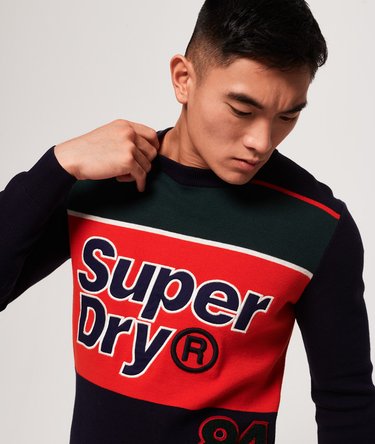 Maglione uomo girocollo Mega Logo Superdry. Modello realizzato in maglia di cotone, presenta un design a blocchi di colore e un ampio logo Superdry applicato sul davanti. Rifinito da loghi Superdry gommati applicati su manica e orlo. Indossalo con un paio di jeans skinny e scarpe da ginnastica per un look caldo e alla moda.
