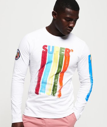 T-shirt uomo a maniche lunghe 76 Surf Superdry. Realizzata in morbidissimo cotone, questa T-shirt a maniche lunghe richiama lo stile rétro dei surfisti anni '70, con un'audace stampa in rilievo del logo Superdry su petto e manica sinistra con righe a effetto pennellata corrispondenti. La T-shirt è impreziosita da una targhetta tonda con logo vintage sulla manica destra. Indossala con un paio di bermuda per un look completo da surfista rétro.